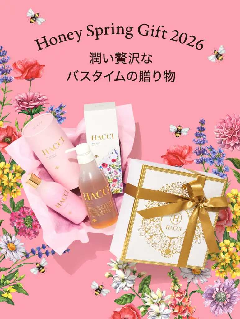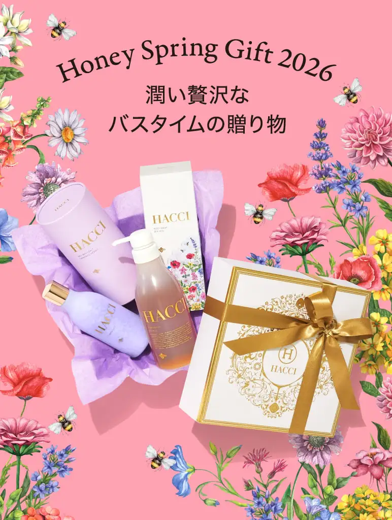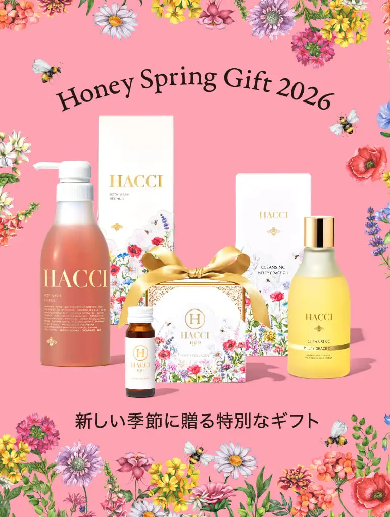 アイテム一覧 UVコレクション スプリングギフト ボディケア インナーケア スキンケア はちみつ・スイーツ GIFT 定期便 全てのアイテムはこちら 新着アイテム 【春限定BOX】ボディウォッシュ BEE HUG ¥6,600(税込) 【春限定BOX】メルティグレース オイルクレンジング ¥7,370(税込) 【春限定BOX】ハニーコラーゲン9本 ¥5,940(税込) 国産 桜はちみつセット ¥5,076(税込) 国産 桜はちみつ ¥2,808(税込) Spring Bathセット(ピンク) ¥12,320(税込) Spring Bathセット(パープル) ¥12,320(税込) ブライトC セラムUV 【ディズニー】 ¥7,700(税込) 日焼け止めミスト D 【ディズニー】 ¥4,950(税込) セラムイン UV ボディクリーム 【ディズニー】 ¥7,040(税込) LONG SELLER ハニーコラーゲン(3本・9本) ¥5,940(税込) はちみつ洗顔石けん ¥5,940(税込) ボディウォッシュ BEE HUG ¥6,600(税込) シートマスク ¥2,420(税込) RANKING ボディウォッシュ BEE HUG ¥6,600(税込) メルティグレース オイルクレンジング ¥7,370(税込) 日焼け止めミスト D 【ディズニー】 ¥4,950(税込) おすすめギフト 国産 桜はちみつセット ¥5,076(税込) Spring Bathセット(パープル) ¥12,320(税込) Spring Bathセット(ピンク) ¥12,320(税込) 【春限定BOX】ボディウォッシュ BEE HUG ¥6,600(税込) 【ギフトBOX】ボディウォッシュ BEE HUG ¥6,600(税込) プティ ハニーショコラ バッグ ¥3,240(税込) GIFT 大切な人へプレゼント ご褒美ギフト LINEでギフトを贈る 【メールやLINEで気軽にプレゼント】 贈るお相手の住所を知らなくても、メールやLINEなどのSNSで気軽にギフトを贈ることができます。 詳しく見る 定期便 「定期商品一覧」はこちら NEWS 2026/2/20 国産 桜はちみつ 発売のお知らせ 2026/3/6 採用情報のお知らせ 2026/2/15 UV COLLECTION 発売開始のお知らせ 2025/12/1 【発売開始】マカロンのように可愛く、とろけるように上質なバスソルト 2025/12/1 チョコレートコレクションにギフトおすすめ商品を追加発売 2025/11/19 @cosme ベストコスメアワード 2025 ベストボディソープ 第1位 受賞! もっと見る ミツバチが運ぶ、甘く濃厚なはちみつ。 それは私たちに届く、幸せの連鎖のはじまり 肌や髪を潤す力。からだと心を温める力。 HACCIは、はちみつがもつ美容の力にこだわり続けます。いつもずっと本物志向、そこにちょっとの遊び心を。 100年後も愛され続ける“本当に良いもの”を追究し、今日も世界中に笑顔の花を咲かせます。 詳しく見る