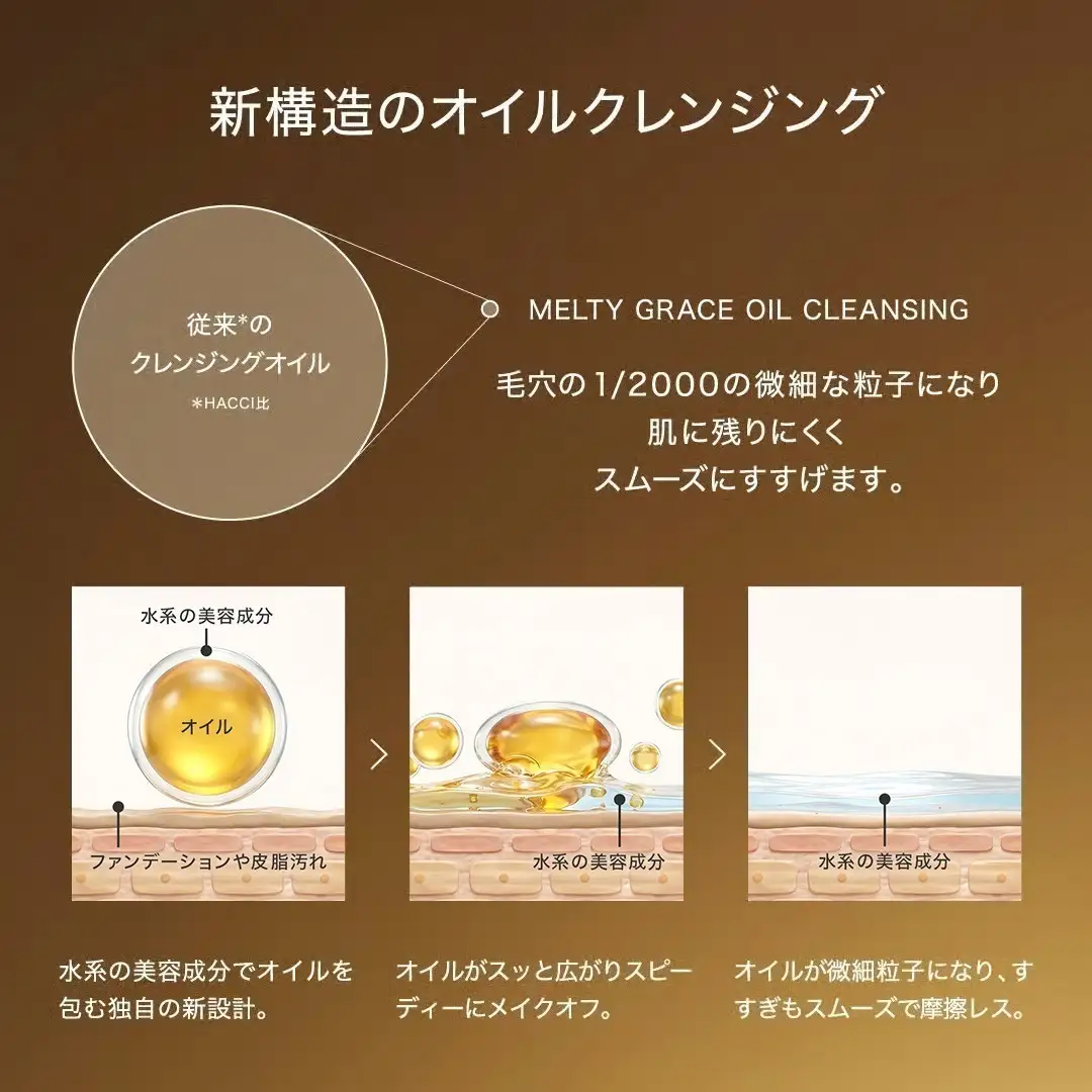 肌にのせた瞬間、うるおいを守りながらメイクとなじみます。なじんだオイルは毛穴1/2000サイズまで微細化。毛穴汚れまでやさしくほどき、なめらかにオフ。