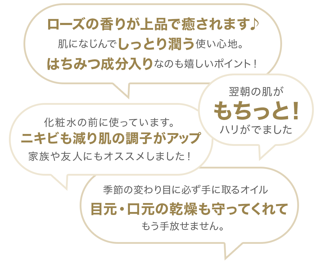 薔薇の香りに包まれる 極上オーガニックオイル 100%オーガニック使い心地がいいオイル ベタつかず、軽やかなテクスチャー 素早く肌になじむ浸透性 ビタミンEを豊富に含むひまわり種子油 アカシアはちみつによる高い保湿効果 肌に潤いとハリを与える3種のオーガニック処方オイルを配合(ダマスクローズ、アルガンオイル、ローズヒップオイル) 乾燥対策に最適 バラの豊かな香りでリラックス効果 HACCIスタッフおすすめ How to use 2~3プッシュを手に取り、顔や首にやさしくマッサージしながらなじませてください。 ※肌状態に合わせ、化粧水の前、あるいは化粧水の後にもお使いいただけます。また、朝晩お使いいただけます。 Fragrance ローズの香り 香水の聖地グラースでも最高峰の香料といわれる貴重なダマスクローズの香りを贅沢に使い、気持ちを落ち着かせ整えるゼラニウムの精油を絶妙なバランスで調香。 フェイスオイル エスケーピオン ご使用目安 約1ヶ月~1ヶ月半 商品番号:LT26032HA ¥15,400(税込) 熨斗を希望する 不要 カートに追加する お気に入りに追加する この商品に関する問い合わせ 薔薇の香りに包まれる 極上オーガニックオイル 100%オーガニック使い心地がいいオイル ベタつかず、軽やかなテクスチャー 素早く肌になじむ浸透性 ビタミンEを豊富に含むひまわり種子油 アカシアはちみつによる高い保湿効果 肌に潤いとハリを与える3種のオーガニック処方オイルを配合(ダマスクローズ、アルガンオイル、ローズヒップオイル) 乾燥対策に最適 バラの豊かな香りでリラックス効果 HACCIスタッフおすすめ How to use 2~3プッシュを手に取り、顔や首にやさしくマッサージしながらなじませてください。 ※肌状態に合わせ、化粧水の前、あるいは化粧水の後にもお使いいただけます。また、朝晩お使いいただけます。 Fragrance ローズの香り 香水の聖地グラースでも最高峰の香料といわれる貴重なダマスクローズの香りを贅沢に使い、気持ちを落ち着かせ整えるゼラニウムの精油を絶妙なバランスで調香。 数量 商品説明 成分・内容量 内容量:32mL成分:ヒマワリ種子油、コムギ胚芽油、アルガニアスピノサ核油、香料、ヒマシ油、ヘーゼルナッツ種子油、ハチミツ、カニナバラ果実油、ニオイテンジクアオイ油、ダマスクバラ花油、ニンジン根エキス、トコフェロール保存方法:10℃~25℃の環境で保存してください。また直射日光のあたる場所、極端に高温・低温の場所を避け、乳幼児の手の届かない所に保管してください。販売者:HACCI's JAPAN(同) 東京都港区南青山5-10-2お問合せ:0120-1912-83 ご使用上の注意点 ・長時間日光にあたる前には使用しないでください。・お肌に異常が生じていないかよく注意して使用してください。化粧品がお肌に合わないとき、即ち次のような場合には、使用を中止してください。そのまま化粧品類の使用を続けますと、症状を悪化させることがありますので、皮膚科専門医等にご相談されることをおすすめします。 (1)使用中、赤味・はれ・かゆみ・刺激・色抜け(白斑等)や黒ずみ等の異常があらわれた場合。(2)使用したお肌に、直射日光があたって上記のような異常があらわれた場合。・傷やはれもの、しっしん等、異常のある部位にはお使いにならないでください。・目に入った場合は、すぐに水かぬるま湯で洗い流してください。・10℃~25℃の環境で保存してください。・直射日光のあたる場所、極端に高温・低温の場所を避け、乳幼児の手の届かない所に保管してください。・天然由来原料を使用している為、色・香りに変化が生じる事がございますが、品質に問題はございません。 よくある質問 関連商品 【定期便】フェイスオイル エスケーピオン ¥13,860 定期購入価格:¥13,860 ハニーローション -HINKAKU- ¥13,200 ハニーレディ(導入美容液) ¥14,300 発酵液クリーム ¥14,300 発酵液ミルク ¥8,580 「定期商品一覧」はこちら 【メールやLINEで気軽にプレゼント】 贈るお相手の住所を知らなくても、 メールやLINEなどのSNSで気軽に ギフトを贈ることができます。 詳しく見る 閲覧履歴 カートに追加する オプションを選択する