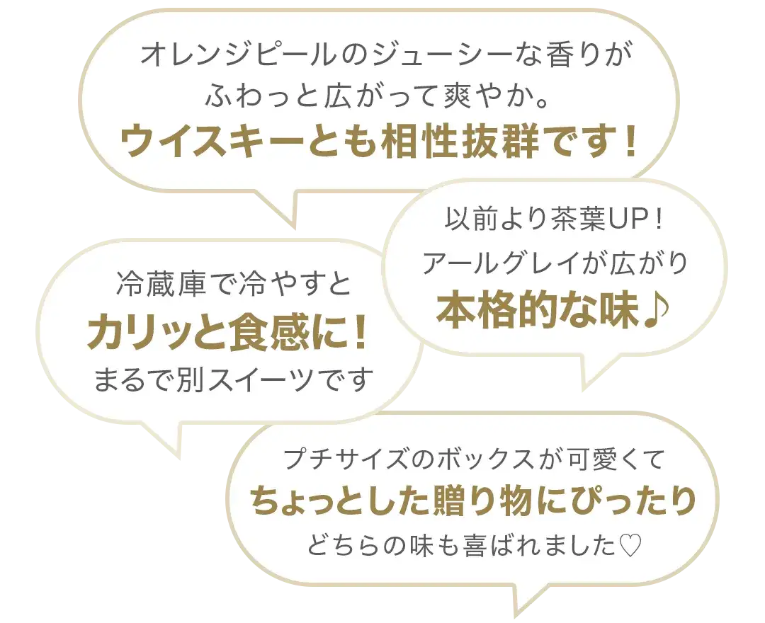 原材料名:チョコレート( ベルギー製造)( 砂糖、ココアバター、全粉乳、カカオマス)、準チョコレート( 砂糖、カカオマス、全粉乳、植物油脂、乳糖、ココア)、植物油脂、紅茶葉、水飴、はちみつパウダー/ 乳化剤、香料、光沢剤、(一部に乳成分・大豆を含む)