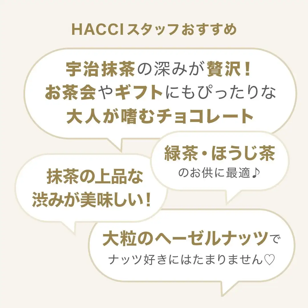 原材料名::チョコレート(国内製造、ベルギー製造)、ヘーゼルナッツ、ココアバター、抹茶、粉末はちみつ、粉糖/乳化剤、香料、(一部に乳成分・大豆を含む)