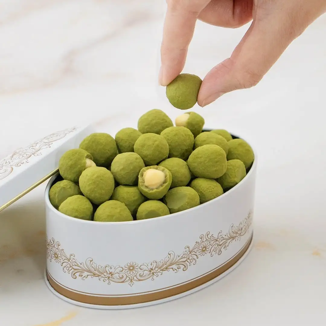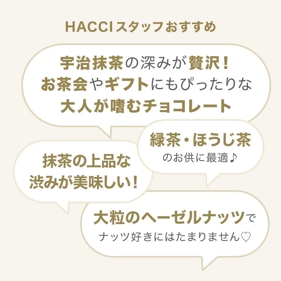 原材料名:チョコレート(国内製造、ベルギー製造)、ヘーゼルナッツ、ココアバター、抹茶、粉末はちみつ、粉糖/乳化剤、香料、(一部に乳成分・大豆を含む)