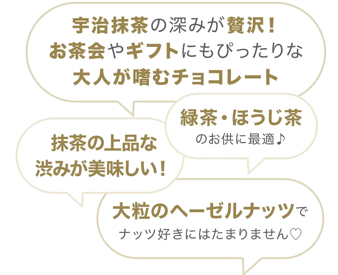 発売以来人気を集めるアイテム! ヘーゼルナッツをホワイトチョコレートで包み、宇治抹茶とアイジングシュガーをまぶしました。ナッツと抹茶が調和した深みのある味わいです。