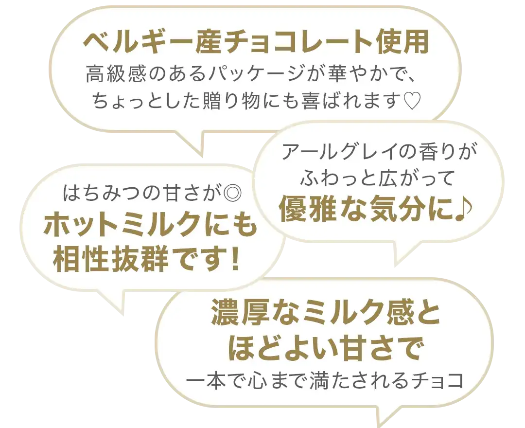 原材料名:チョコレート(ベルギー製造)(砂糖、ココアバター、全粉乳、カカオマス)、ココアバター、紅茶葉、はちみつパウダー/香料、乳化剤、(一部に乳成分・大豆を含む)
