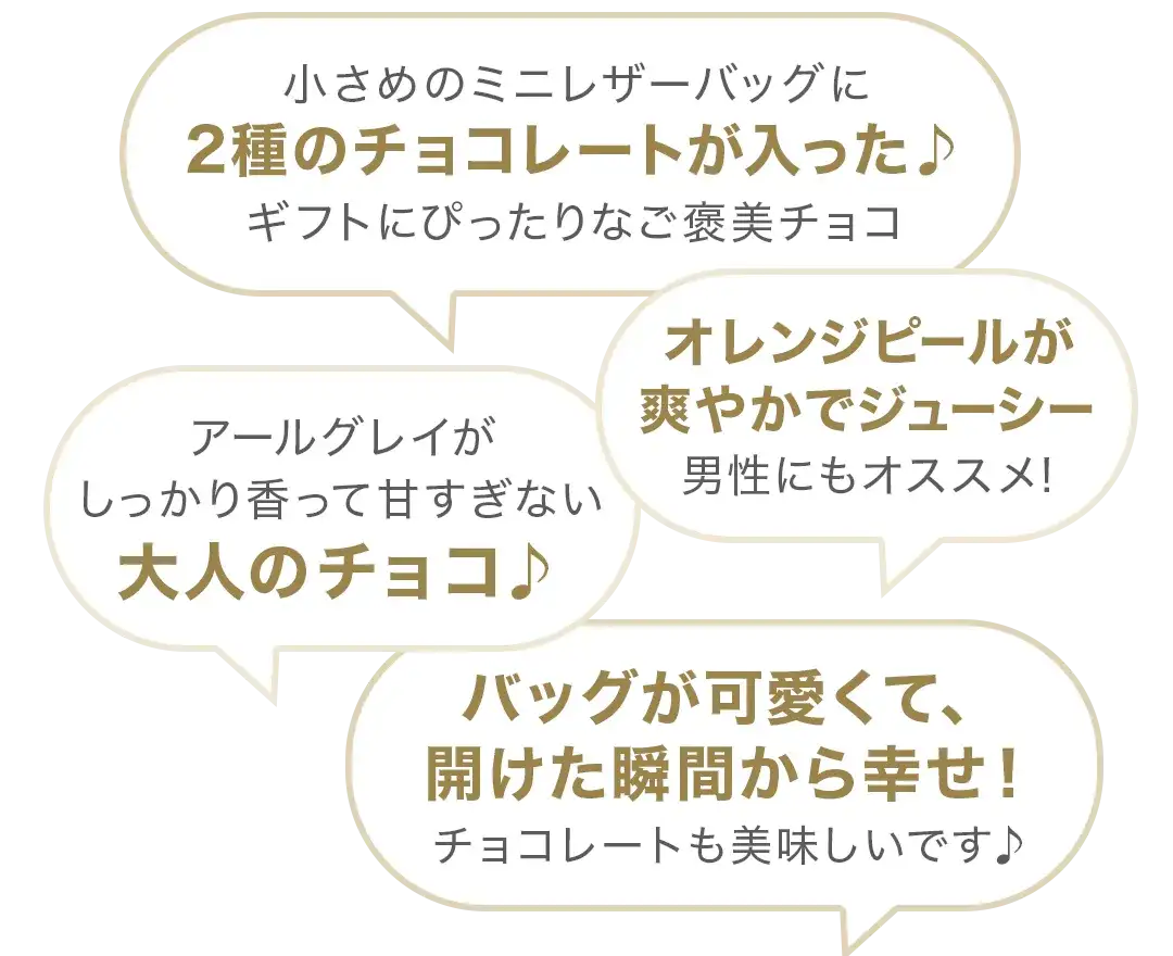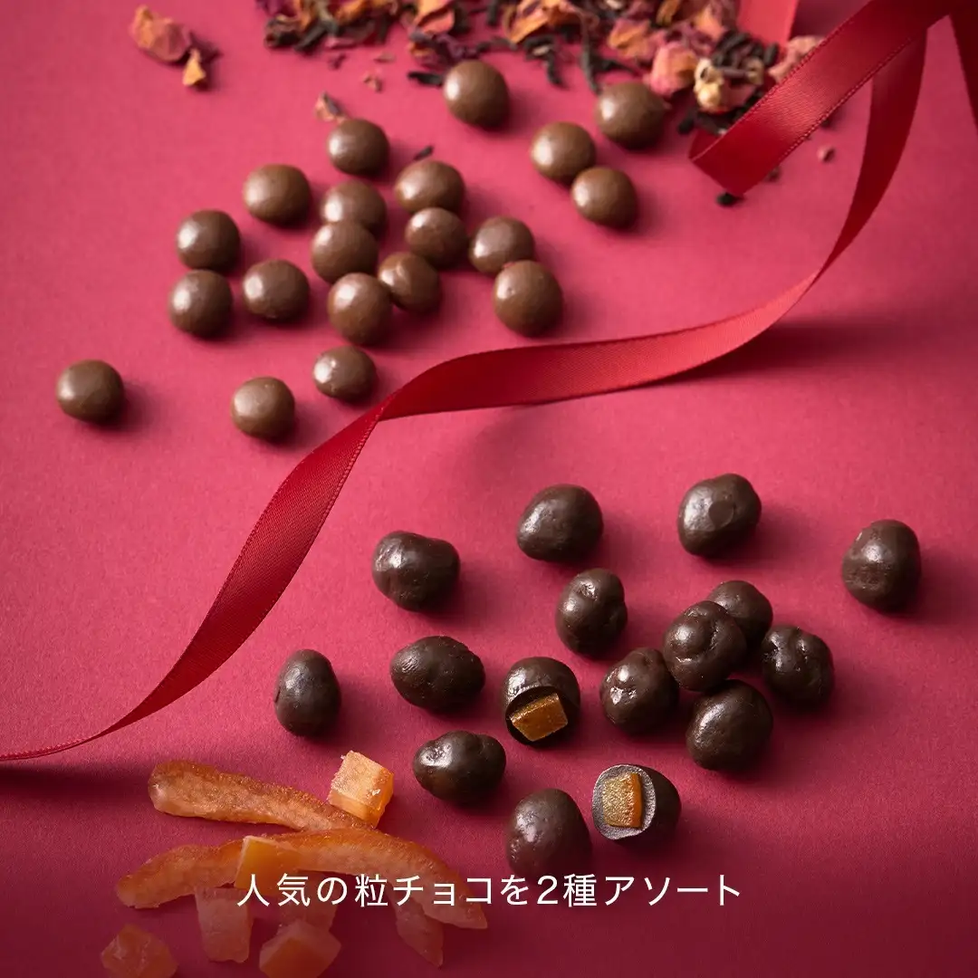 原材料名:チョコレート( ベルギー製造)( 砂糖、ココアバター、全粉乳、カカオマス)、準チョコレート( 砂糖、カカオマス、全粉乳、植物油脂、乳糖、ココア)、植物油脂、紅茶葉、水飴、はちみつパウダー/ 乳化剤、香料、光沢剤、(一部に乳成分・大豆を含む)