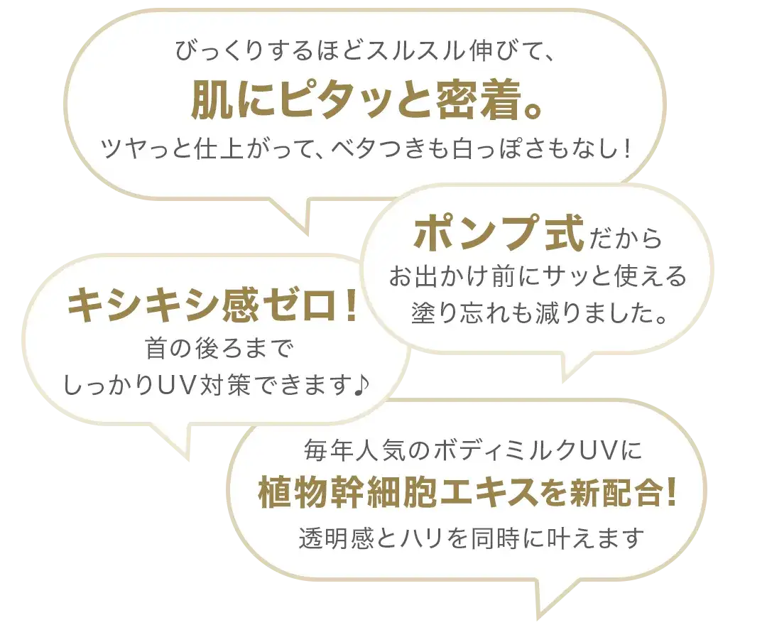 成分:水、PG、メトキシケイヒ酸エチルヘキシル、シクロペンタシロキサン、オクトクリレン、ハチミツ、ローヤルゼリーエキス、プロポリスエキス、リンゴ果実培養細胞エキス、ブドウ果実細胞エキス、ロドデンドロンフェルギネウム葉培養細胞エキス、ライラック葉培養細胞エキス、セラミドEOP、セラミドNG、セラミドNP、セラミドAP、セラミドAG、レシチン、グリセリン、イソマルト、水添レシチン、フィトステロールズ、エチルヘキシルグリセリン、カルボマー、(アクリレーツ/アクリル酸アルキル(C10-30))クロスポリマー、(アクリル酸ヒドロキシエチル/アクリロイルジメチルタウリンNa)コポリマー、t-ブチルメトキシジベンゾイルメタン、ポリソルベート60、エタノール、BG、水酸化K、EDTA-4Na、キサンタンガム、マルトデキストリン、香料、ジエチルアミノヒドロキシベンゾイル安息香酸ヘキシル、フェノキシエタノール