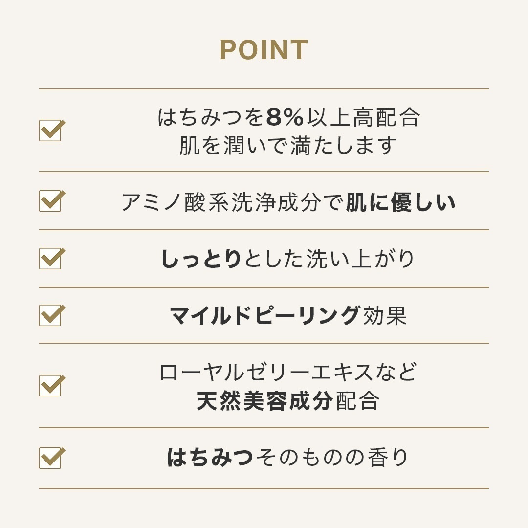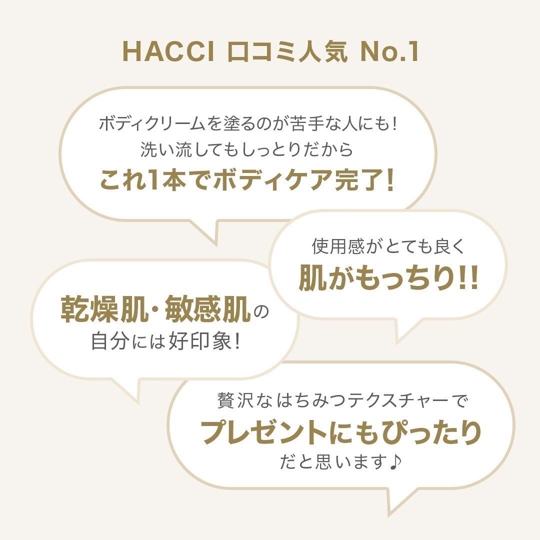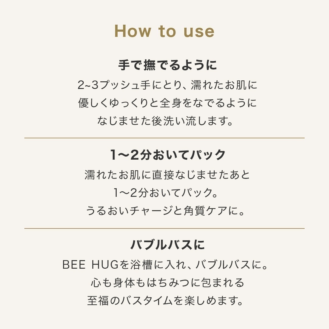 ギフトにぴったり♪ 贈答用デザインの ボディウォッシュ BEE HUG。 はちみつで身体を洗いましょう ボディウォッシュ BEE HUG はちみつを8%以上高配合 肌を潤いで満たします アミノ酸系洗浄成分で肌に優しい しっとりとした洗い上がり マイルドピーリング効果 ローヤルゼリーエキスなど 天然美容成分配合 はちみつそのものの香り HACCI 口コミ人気 No.1 How to use 手で撫でるように 2~3プッシュ手にとり、濡れたお肌に 優しくゆっくりと全身をなでるように なじませた後洗い流します。 1~2分おいてパック 濡れたお肌に直接なじませたあと 1~2分おいてパック。 うるおいチャージと角質ケアに。 バブルバスに BEE HUGを浴槽に入れ、バブルバスに。 心も身体もはちみつに包まれる 至福のバスタイムを楽しめます。 Fragrance バスルームいっぱいに広がるのは はちみつの芳醇な香り。 GIFT 大切な贈り物に “あなたらしい言葉”を添えられる メッセージカードをご用意しております。 ※カードは無地でのお渡しとなります。印字対応は行っておりません。 ご希望の方はこちら 通常パッケージはこちら >「ボディケア」カテゴリーはこちら 【ギフトBOX】ボディウォッシュ BEE HUG 385mL ご使用目安 約2か月 商品番号:BW01400HA-PA25026MA ¥6,600(税込) 熨斗を希望する 不要 カートに追加する お気に入りに追加する この商品に関する問い合わせ ギフトにぴったり♪ 贈答用デザインの ボディウォッシュ BEE HUG。 はちみつで身体を洗いましょう ボディウォッシュ BEE HUG はちみつを8%以上高配合 肌を潤いで満たします アミノ酸系洗浄成分で肌に優しい しっとりとした洗い上がり マイルドピーリング効果 ローヤルゼリーエキスなど 天然美容成分配合 はちみつそのものの香り HACCI 口コミ人気 No.1 How to use 手で撫でるように 2~3プッシュ手にとり、濡れたお肌に 優しくゆっくりと全身をなでるように なじませた後洗い流します。 1~2分おいてパック 濡れたお肌に直接なじませたあと 1~2分おいてパック。 うるおいチャージと角質ケアに。 バブルバスに BEE HUGを浴槽に入れ、バブルバスに。 心も身体もはちみつに包まれる 至福のバスタイムを楽しめます。 Fragrance バスルームいっぱいに広がるのは はちみつの芳醇な香り。 GIFT 大切な贈り物に “あなたらしい言葉”を添えられる メッセージカードをご用意しております。 ※カードは無地でのお渡しとなります。印字対応は行っておりません。 ご希望の方はこちら 通常パッケージはこちら >「ボディケア」カテゴリーはこちら 数量